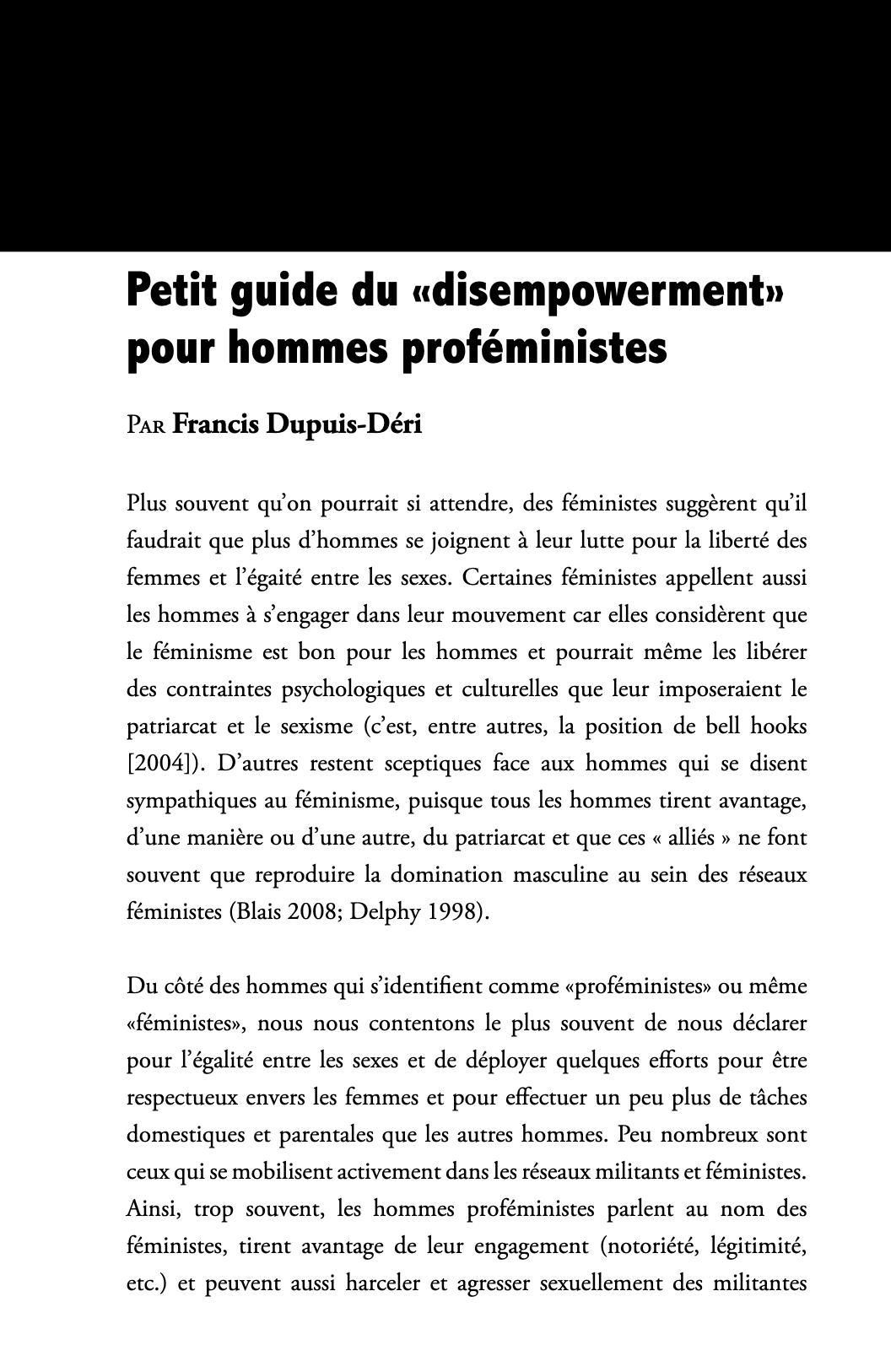 Parmi ses contributions figure un document intitulé « Petit guide de « disempowerment » pour hommes proféministes ». Il s’agit d’un texte court, accessible gratuitement, qui s’adresse aux hommes souhaitant être alliés des féministes tout en adoptant une posture réfléchie et critique. à consulter gratuitement ici